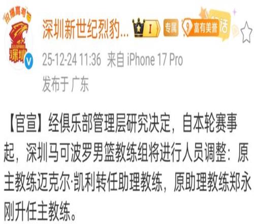 然而让人意想不到的是,本赛季第二位下个主帅是深圳男篮的外教凯利。根据深圳男篮官方公告,凯利确定下课,辽宁名宿郑永刚走马上任。有趣的是,这已经是郑永刚连续两个赛季在赛季中途接手,上赛季他接替的是周鹏。